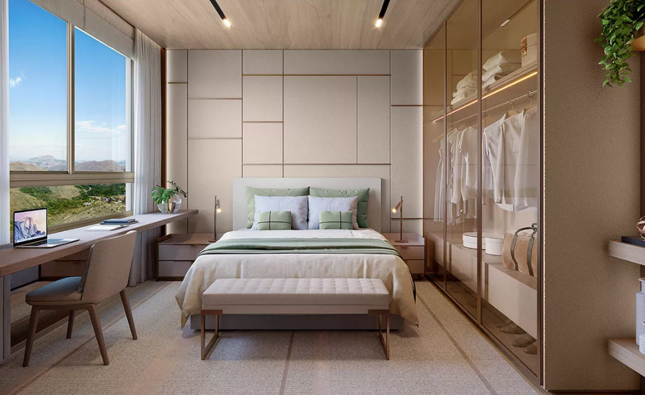 Varanda com vista panorâmica, esquadrias amplas, venezianas motorizadas nos quartos.