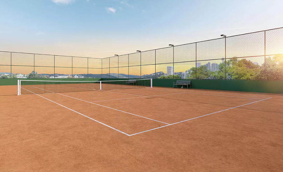 Esportes: quadra de tênis de saibro, quadra multiuso para padel/pickleball/futebol.